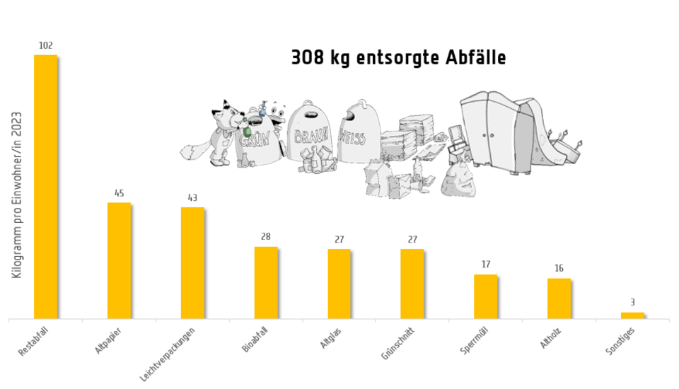 Ein Balkendiagramm. Oberhalb der Balken sind Altglascontainer abgebildet, welche gerade von Pfiffikus (Fuchs) und Toni (Tonne) mit einer grünen und blauen Falsche befüllt wird. Neben dem Altglascontainer befindet sich ein Stapel Altpapier sowie eine Ansammlung an Leichtverpackungen, bestehend aus einem Tetra-Pack, eine Spülmittelflasche, einem Joghurtbecher. Neben der Ansammlung von Leichtverpackungen steht ein Restabfallsack. Hinter diesem Restabfallsack ist ebenso ein Sperrmüllhaufen zu sehen. In der Mitte ein großer Schrank, am Schrank angelehnt eine Matratze sowie ein altes Regal auf dem Kopf liegend. Links vom Schrank ist ein alter Stuhl zu sehen. Über den Bildern steht die Überschrift "308 kg entsorgte Abfälle. Die gelben Balken vom Diagramm werden von links nach rechts hin kleiner. Die Beschriftung der einzelnen Balken beginnt wie folgt vom größten Wert zum kleinsten Wert. Restabfall, Altpapier, Leichtverpackungen, Bioabfall, Altglas, Grünschnitt, Sperrmüll, Altholz, Sonstiges